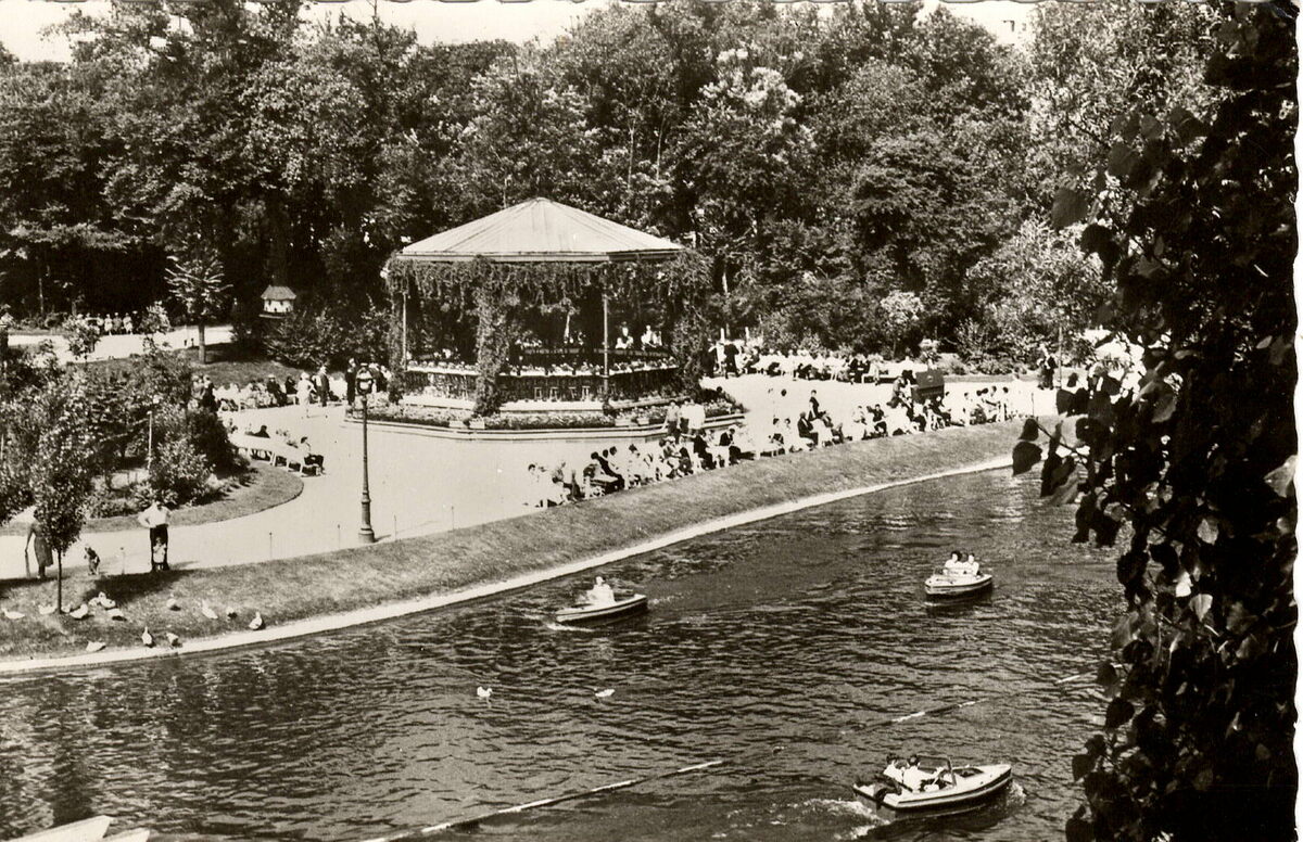 Uitgave Prevot. - Oostende, Leopoldpark. - Ostende, Parc Léopold. - Tijdens de gemeenteraad van 18 maart 1949 werd een gedeelte van de parkvijver in vergunning gegeven aan pvba "Les Amusements Populaires" vertegenwoordigd door Robert Lannoye, F. Content en A. Lippens voor het inrichten van een attractie met motorbootjes. In 1973 werd dit afgeschaft.