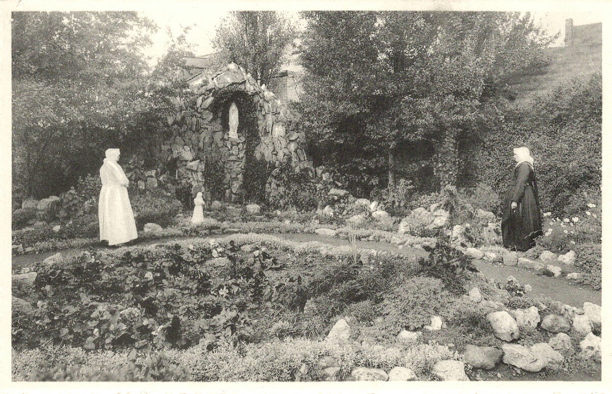 Formaat : 9 x 14 cm. - Nels. - H. Hart Kliniek, Oostende. Grot met hof.