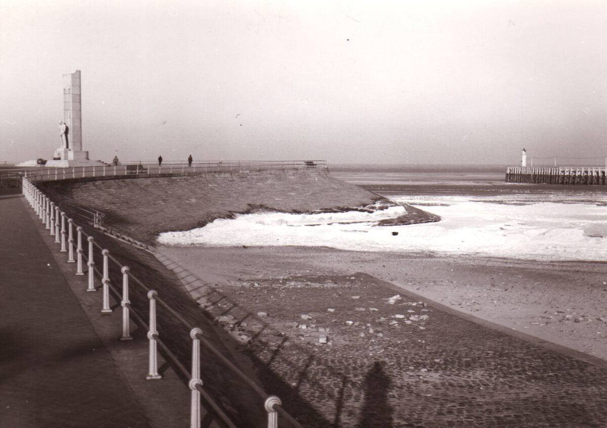 Het Zeeheldenplein, met het onafgewerkt "Monument der Zeelieden". Rechts, het Klein Strand onder sneeuw en ijs en het Weststaketsel.
