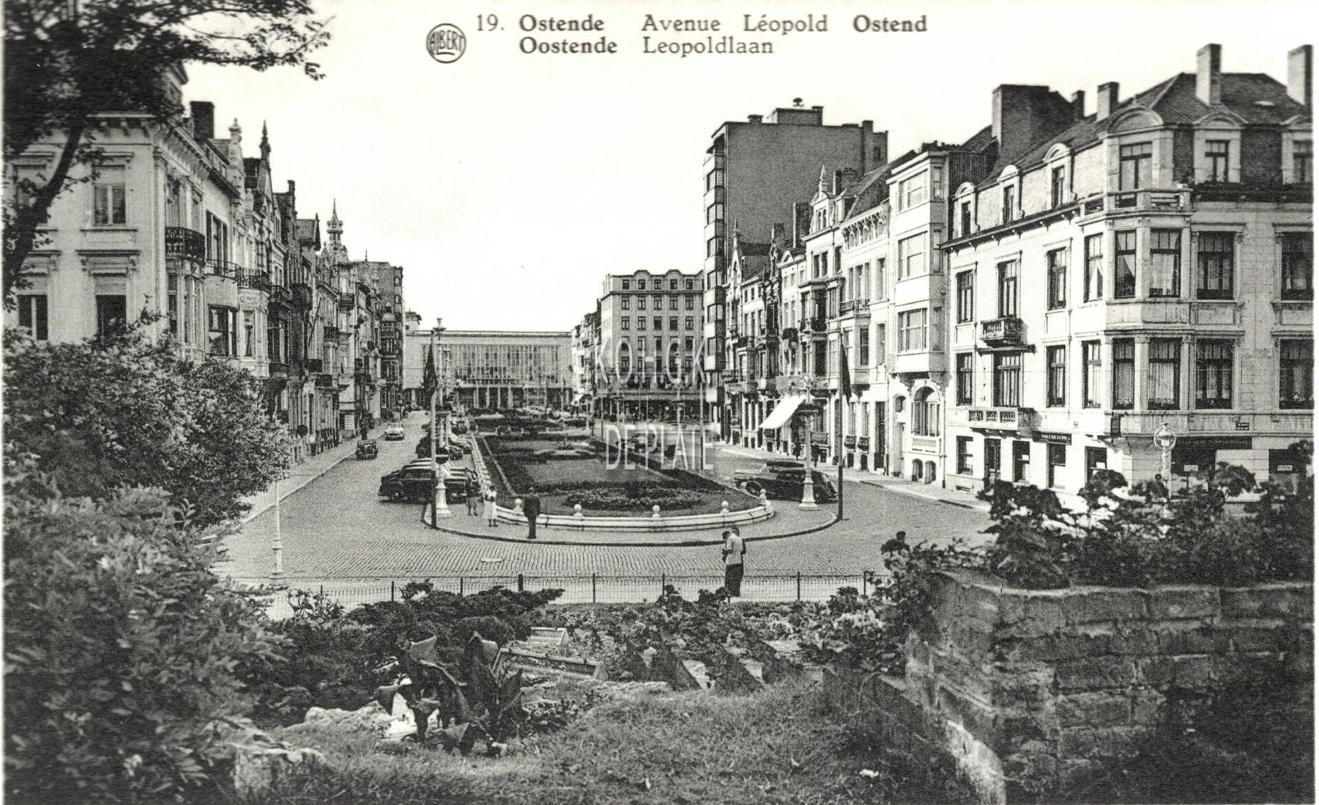 Formaat : 9 x 14 cm. - Albert. N°19. Phototypie A. Dohmen, Bruxelles. - Ostende - Avenue Léopold. Ostend. Oostende - Leopoldlaan. - Zicht vanaf het bloemenuurwerk in het Leopoldpark richting kursaal.