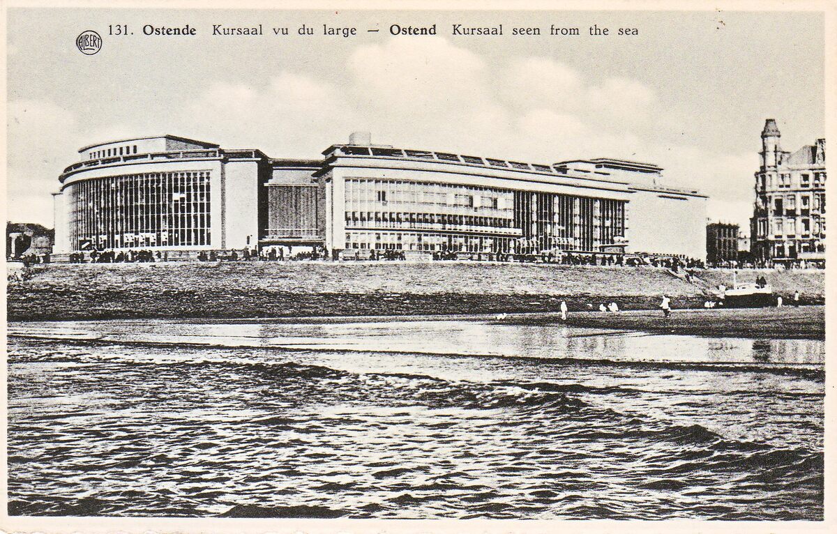 Albert, nr.131. Phototypie A. Dohmen, Bruxelles. - Ostende - Kursaal vu du large. Ostende - Kursaal seen from the sea. - De westgevel en detail van de noordgevel van het vierde Kursaal, gelegen langs de Albert I-promenade, gezien vanaf het Groot Strand.