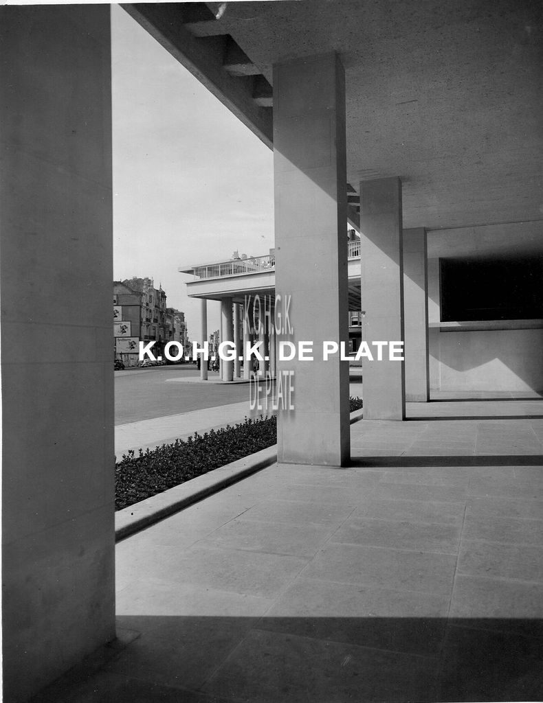 Formaat : 23,5 x 17,5 cm. - Gedeelte van de zuidgevel en van de luifel van de hoofdingang van het vierde Kursaal. Links, de Van Iseghemlaan.