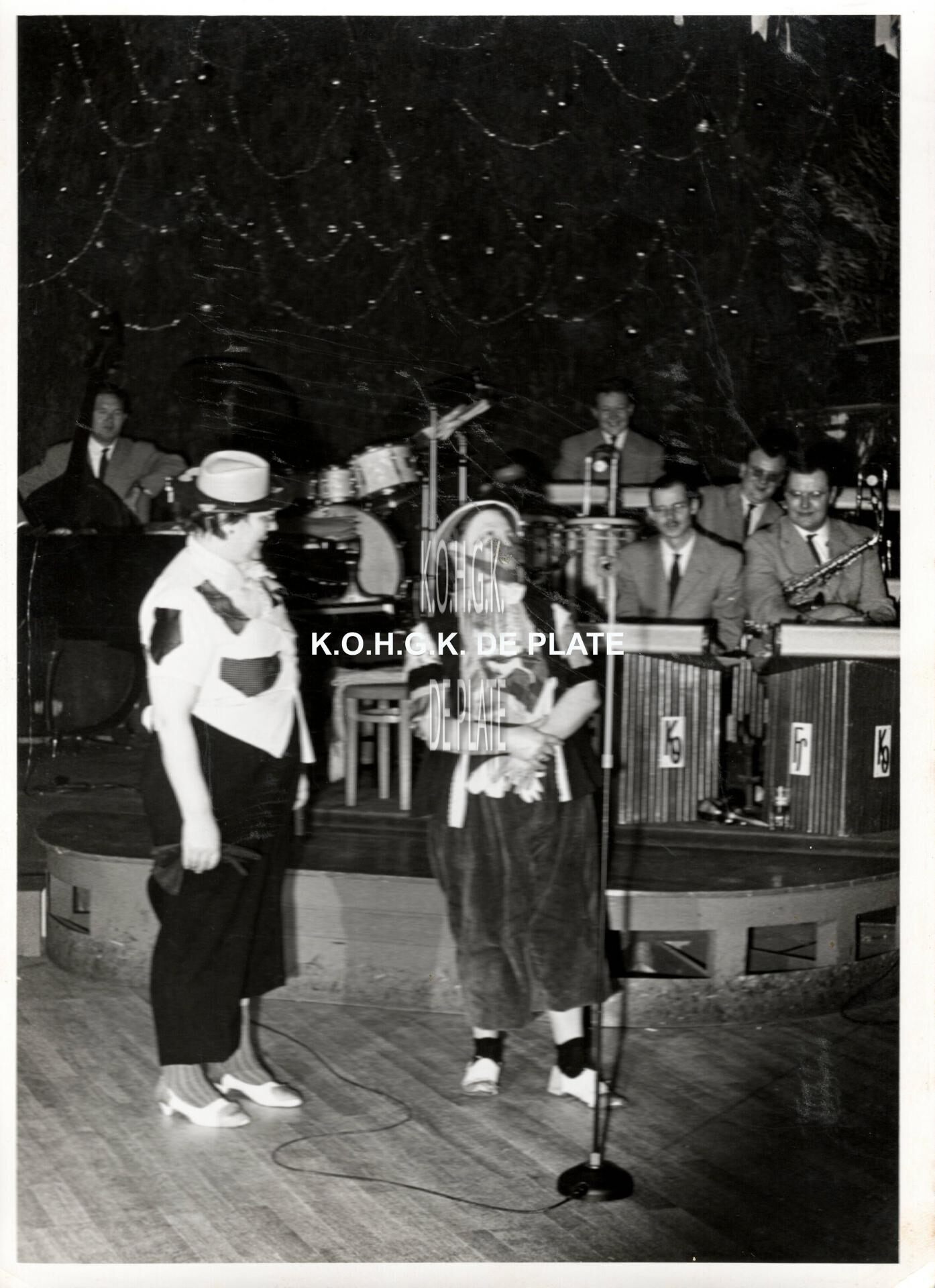 Formaat : 18 x 13 cm. - Irma Westerlinck en Madeleine Vens in een sketch. Op de achtergrond, het kursaalorkest van Franz Lebrun.