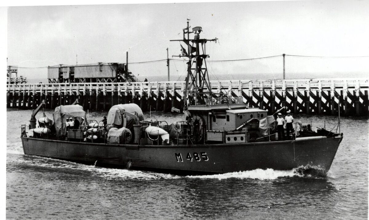 Photo Luc. - De mijnenveger werd gebouwd bij Mercantile Marine Yd. te Kruibeke in de periode 1958 - 1959. Op de achtergrond, het Ooststaketsel