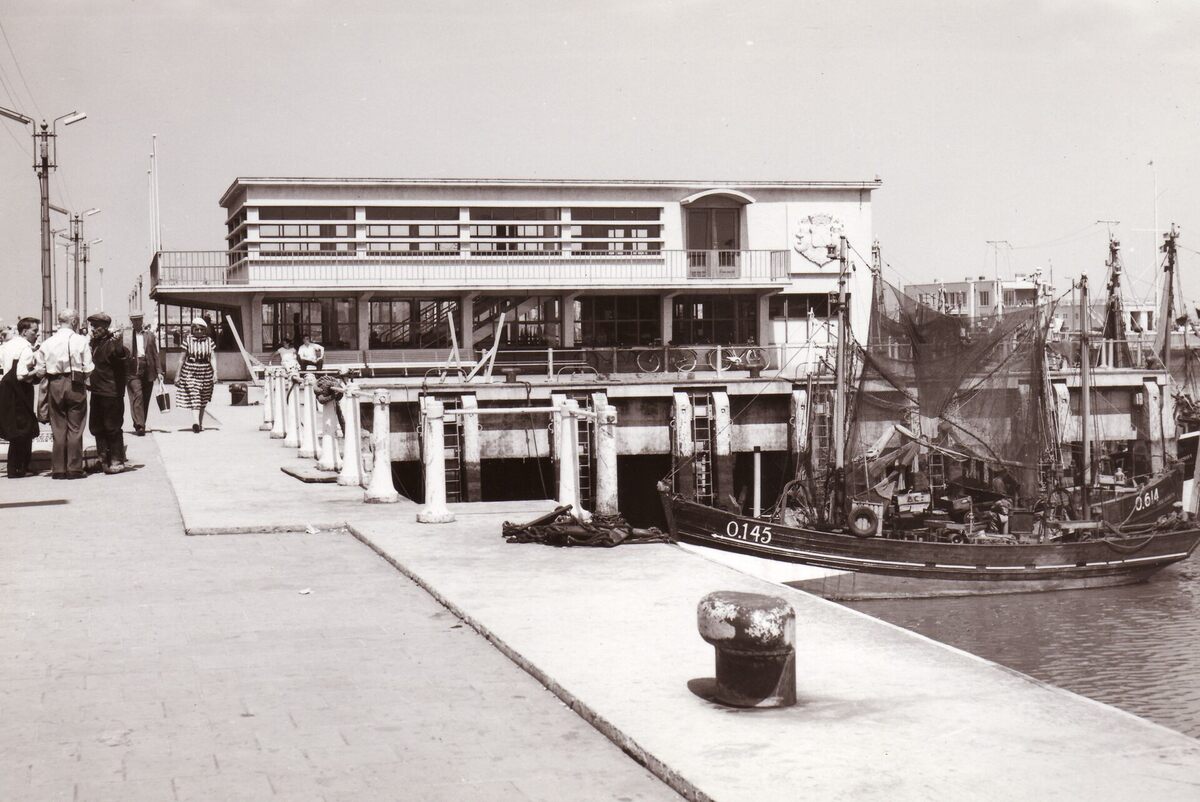 Formaat : 13 x 18 cm. - De pas gebouwde Garnaalmijn aan de Visserskaai. De O.145 Roland ligt in het Montgomerydok