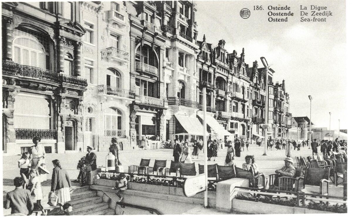 Formaat : 9 x 14 cm. - Albert. N°186. Phototypie A. Dohmen, Bruxelles. - Ostende - La Digue. Oostende - De Zeedijk. Ostend - Sea-front. De villa's in de Belle Epoque stijl, vooraan detail van Villa Maritza , Villa Jane, Villa des Dunes. Hier nabij de badinstallaties.