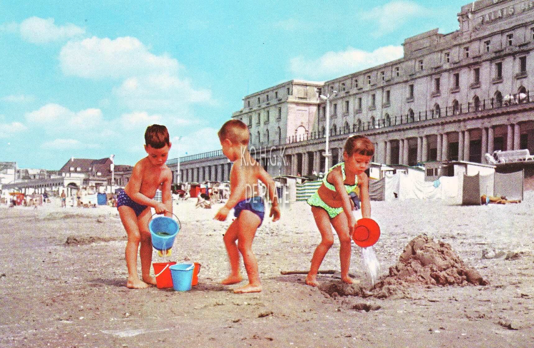Postkaart JC. - Strandrecreatie op het Groot Strand nabij de Koninklijke Gaanderijen gelegen langs de Zeedijk. In het midden het Thermae Palace