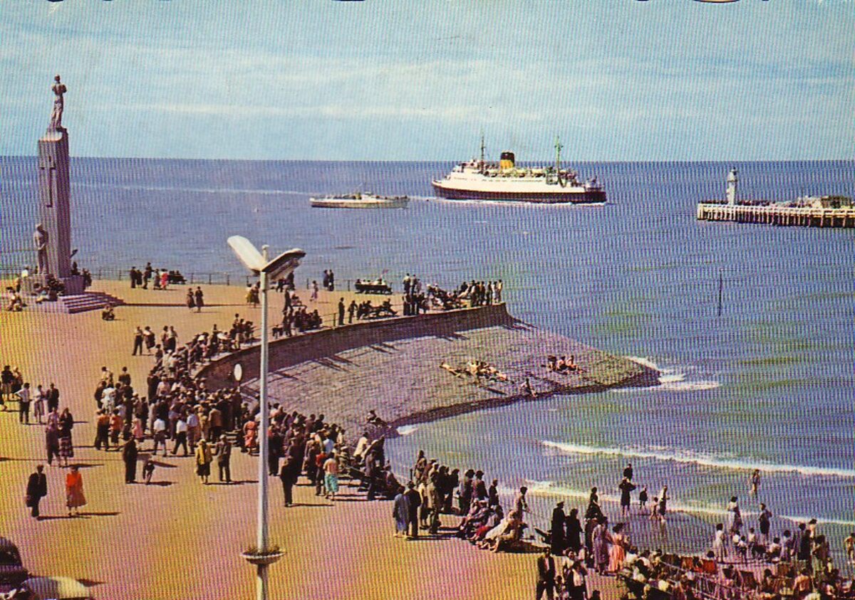 AFK, N° H933/6. - Het "Nationaal Monument der Zeelieden" op het Zeeheldenplein. De carferry "Artevelde" nadert de havengeul van Oostende