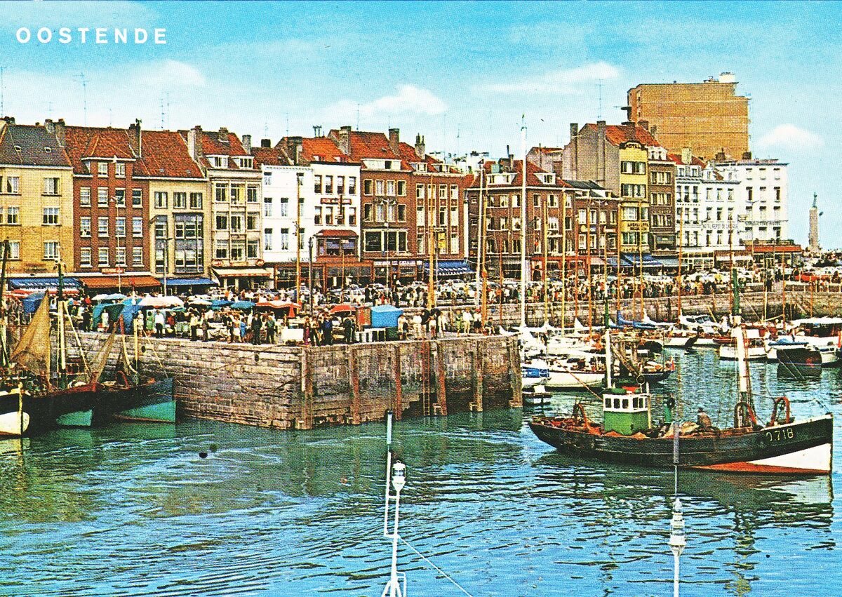 Postkaart AVM. - Plezier- en vissersvaartuigen gemeerd in het Montgomerydok nabij de Vistrap. Rechts, de O.718 "Yves-Patrick". Op de achtergrond, de Visserskaai, met de Nieuwstraat (links), de Cirkelstraat (midden) en de Langestraat (rechts)