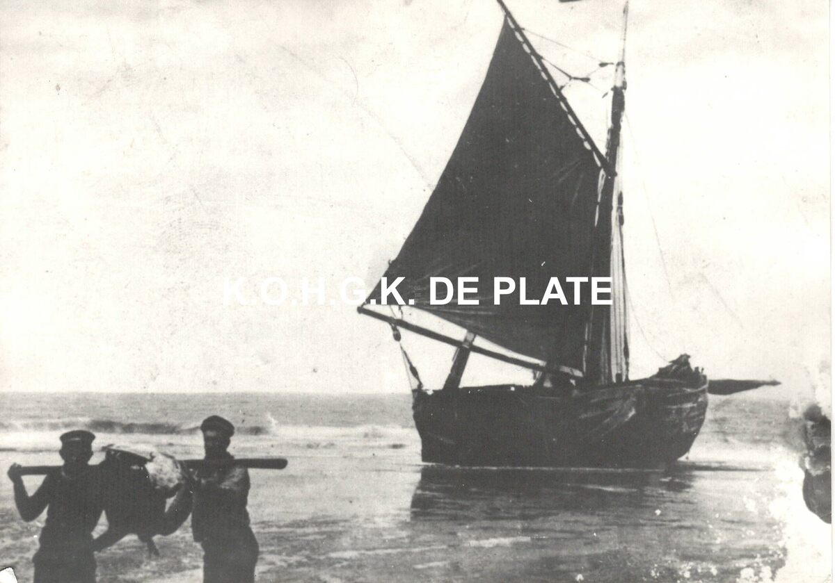 Formaat : 10,5 x 15 cm. - Zeilvisservaartuig op het strand. De vangst wordt gelost.