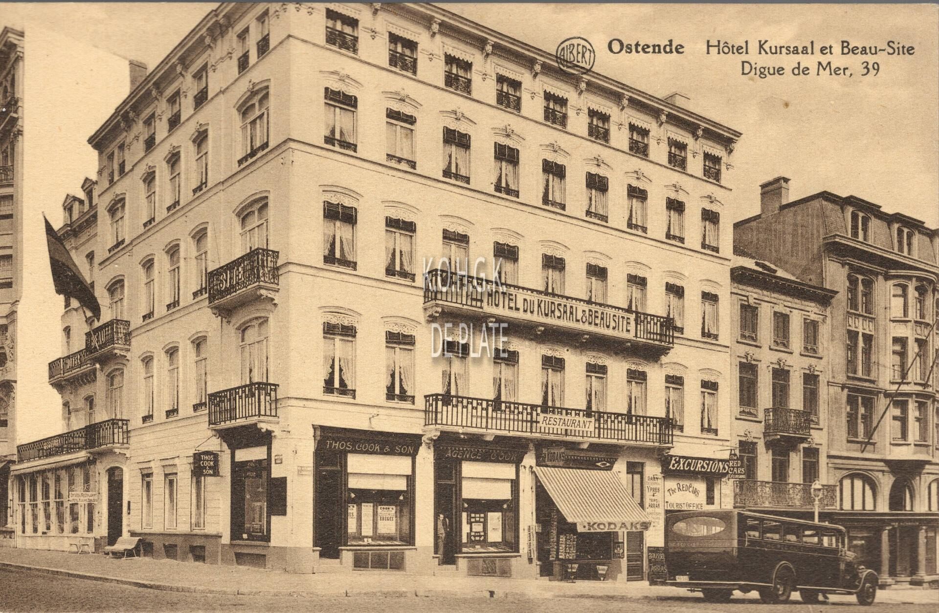 Formaat : 9 x 14 cm. - Albert. Phototypie, A. Dohmen, Bruxelles. - Hotel Kursaal et Beau Site. Digue de Mer, 39. Op de hoek het reisbureau van "Thomas Cook" en in de Vlaanderenstraat 41, het reisbureau "The Red Cars" met hun autocar