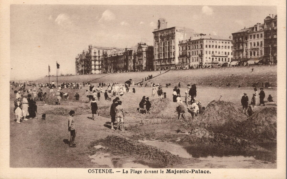 De Zeedijk ten oosten van het kursaal richting de havengeul. In het midden het grote Majestic Palace Hotel. Het was open van maart tot oktober. Het was voorzien van lopend water en 80 kamers hadden een bad. Op het groot strand is er een wedstrijd forten" f zandkastelen bouwen voor kinderen gaande