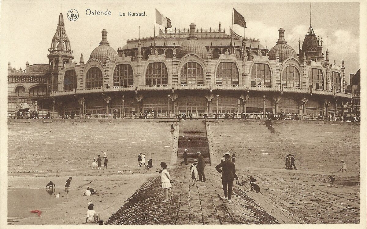 Nels. Librairie Devriendt, 33, rue Adolphe Buyl, Ostende. - Ostende - Le Kursaal. - De noordgevel gelegen langs de Zeedijk. Strandrecreatie op het "groot strand" en de golfbreker. Map 041D/77a