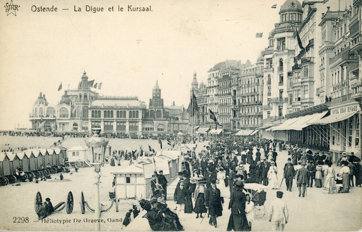 Veel wandelaars op de Zeedijk, het Groot Strand met de badkarren en op de achtergrond het Derde Kursaal tijdens de Belle Epoque.