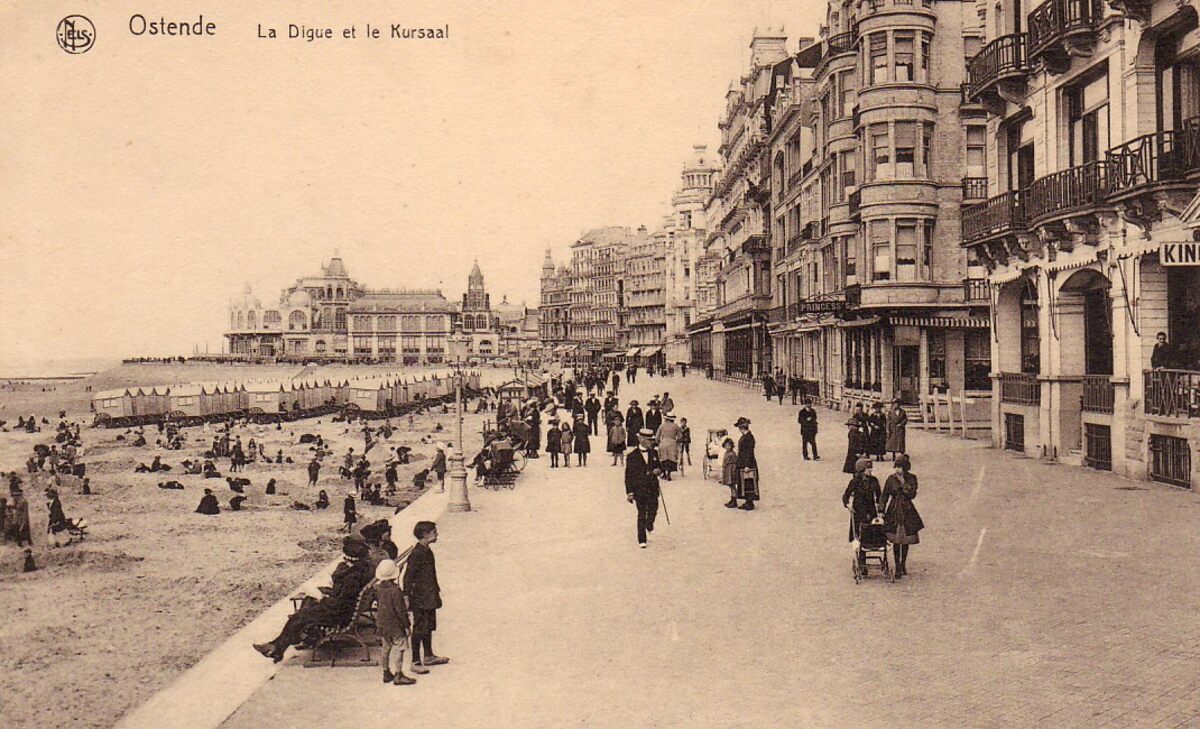 Nels/Thill 13, 40. - Genieten van een wandeling op de Zeedijk, met rechts, de grote hotels en links, strandrecreatie op het Groot Strand en de traditionele badkarren. Op het einde, de westgevel van het derde Kursaal.