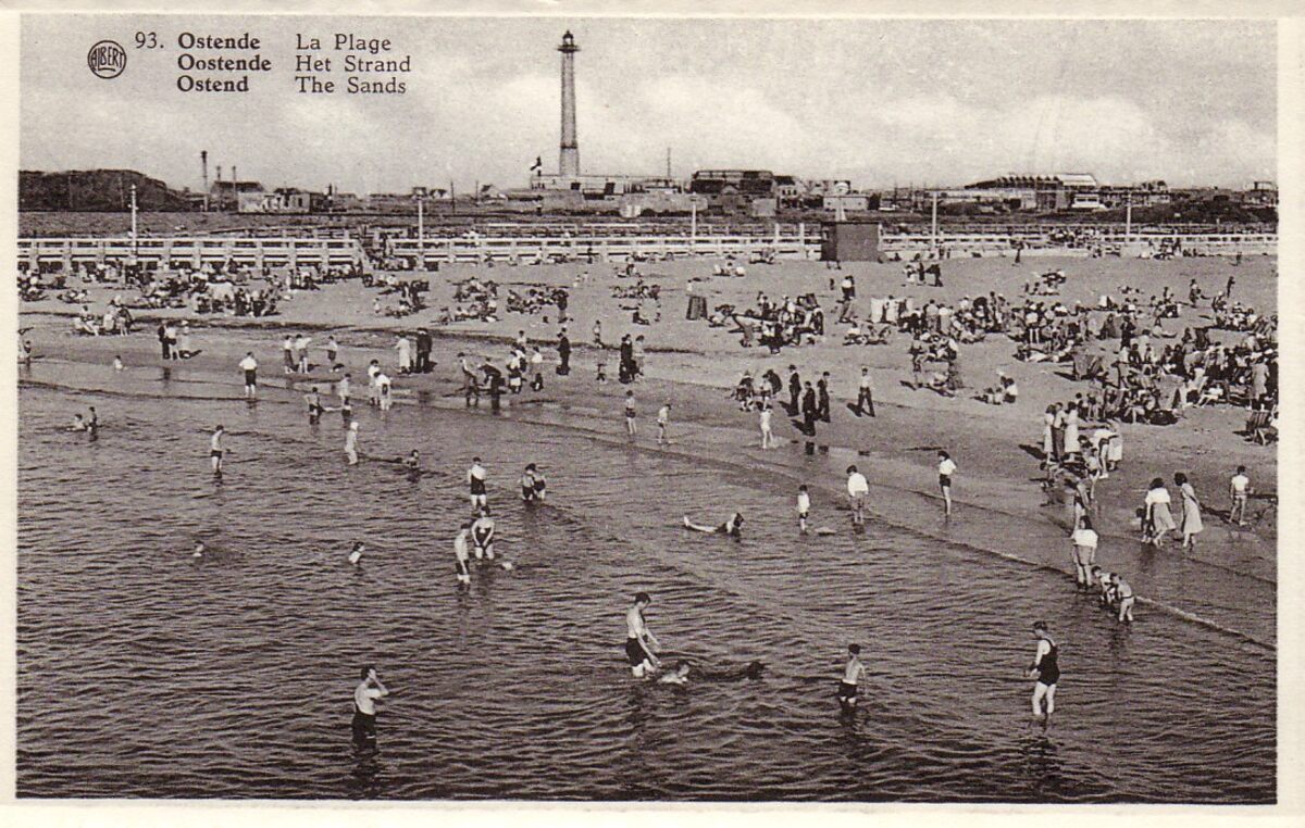 Albert, N° 93. - Ostende - La Plage. Oostende - Het Strand. Ostend - The Sands. - Strandrecreatie op het Klein Strand. De Tweede Wereldoorlog is voorbij, de badkarren zijn verdwenen en op de oosteroever staat de vierde vuurtoren, "Lange Nelle".