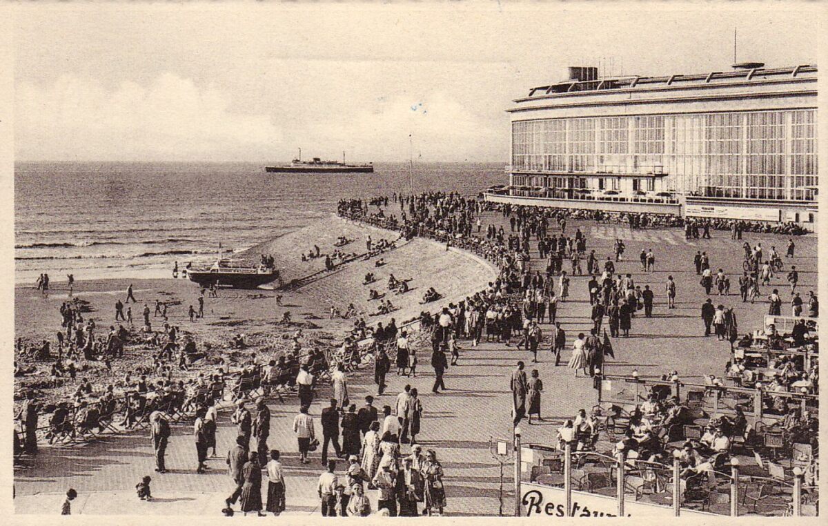 Nels, n° 76. - Detail van de westgevel van het vierde Kursaal gelegen langs de Albert I-promenade. Dit beschut plekje wordt ook "Petit Nice" genoemd. Het Groot Strand, waar je in de vijftiger jaren met een amfibieboot een tochtje op zee kon maken.