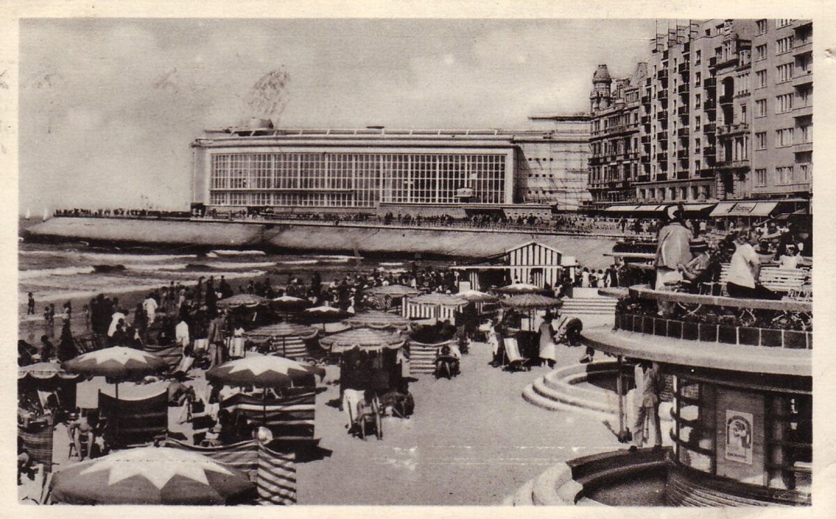 Strandrecreatie op het Groot Strand nabij de badinstallaties onder de Albert I-promenade. Op de achtergrond, de westgevel van het vierde Kursaal.