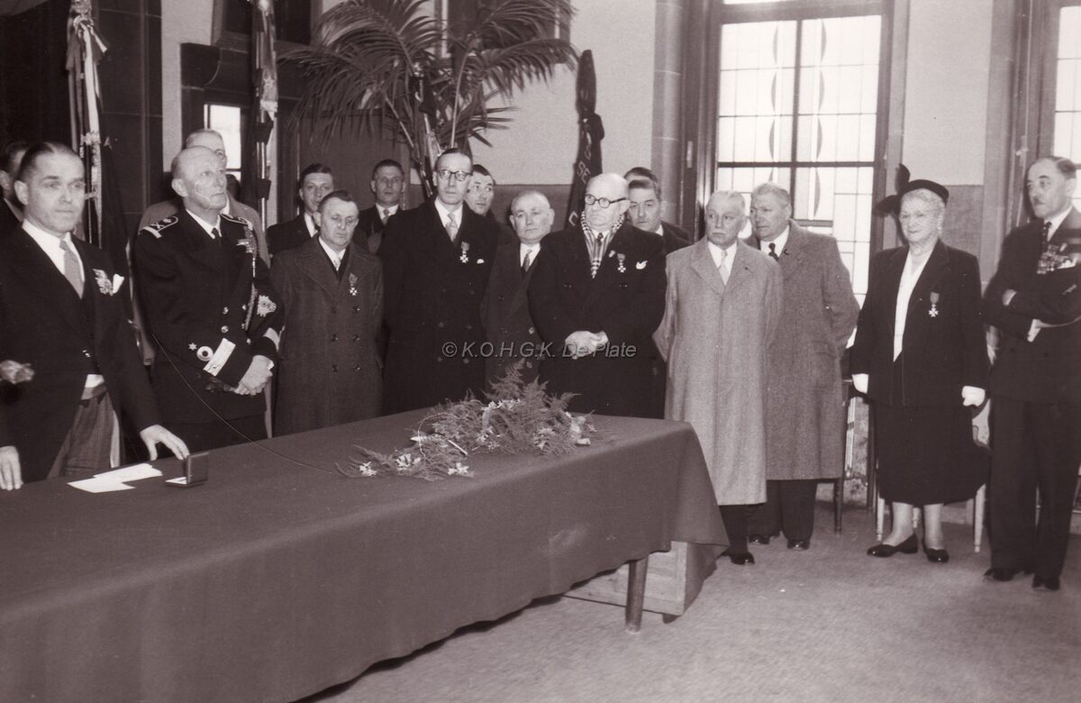 Formaat : 13 x 18 cm. - Ontvangst op het dd.stadhuis (huidig Gerechtshof) ter gelegenheid van een vaderlandse plechtigheid, Achter de tafel uiterst links, burgemeester Adolf Van Glabbeke en naast hem commodore Georges Timmermans.