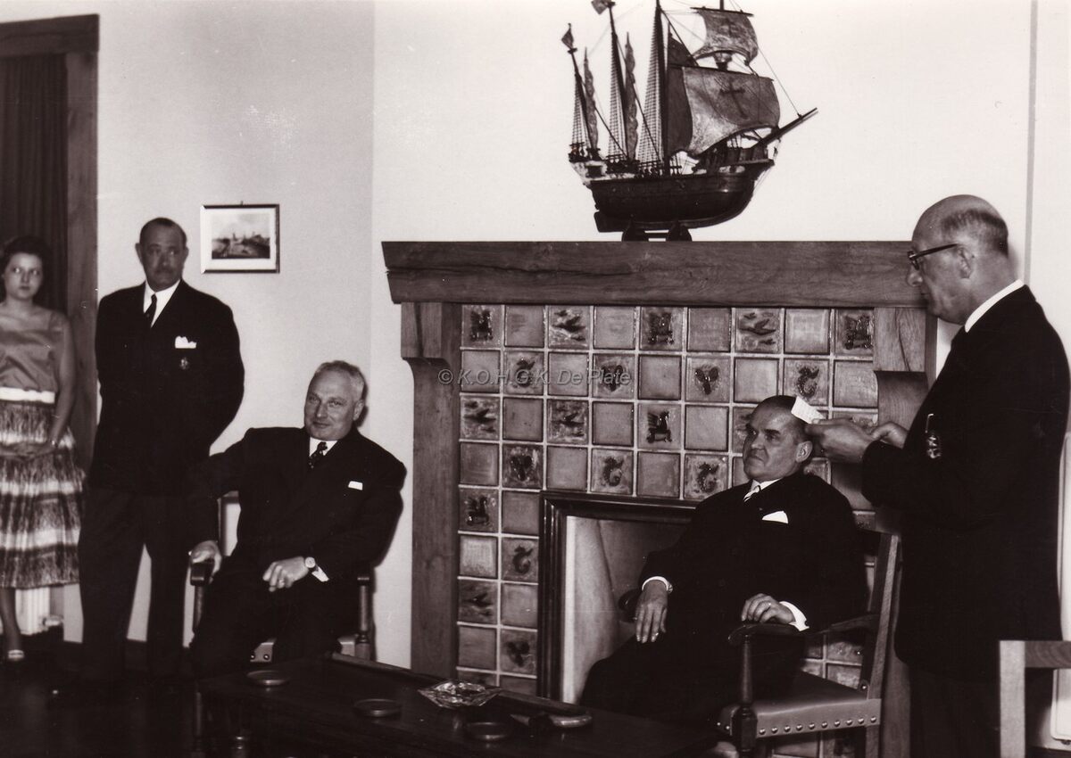 Formaat : 13 x 18 cm. - Burgemeester Adolf Van Glabbeke luistert naar een toespraak van commodore Georges Timmermans, voorzitter van de Royal North Sea Yacht Club, in hun lokaal. Links van de schouw Joseph Verschaeve, hoofdingenieur van Bruggen en Wegen.