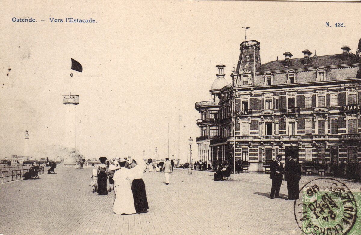 Ostende - Vers l'Estacade. Links de eerste vuurtoren, in de volksmond, de "vlaggestok" genoemd. Gebouwd in 1771 en in gebruik tot 1859. Op deze plaats staat nu het Monument der Zeelieden (Zeeheldenplein). Uiterst links, op de oosteroever de tweede vuurtoren. Rechts, het hotel "Royal Phare Hotel"