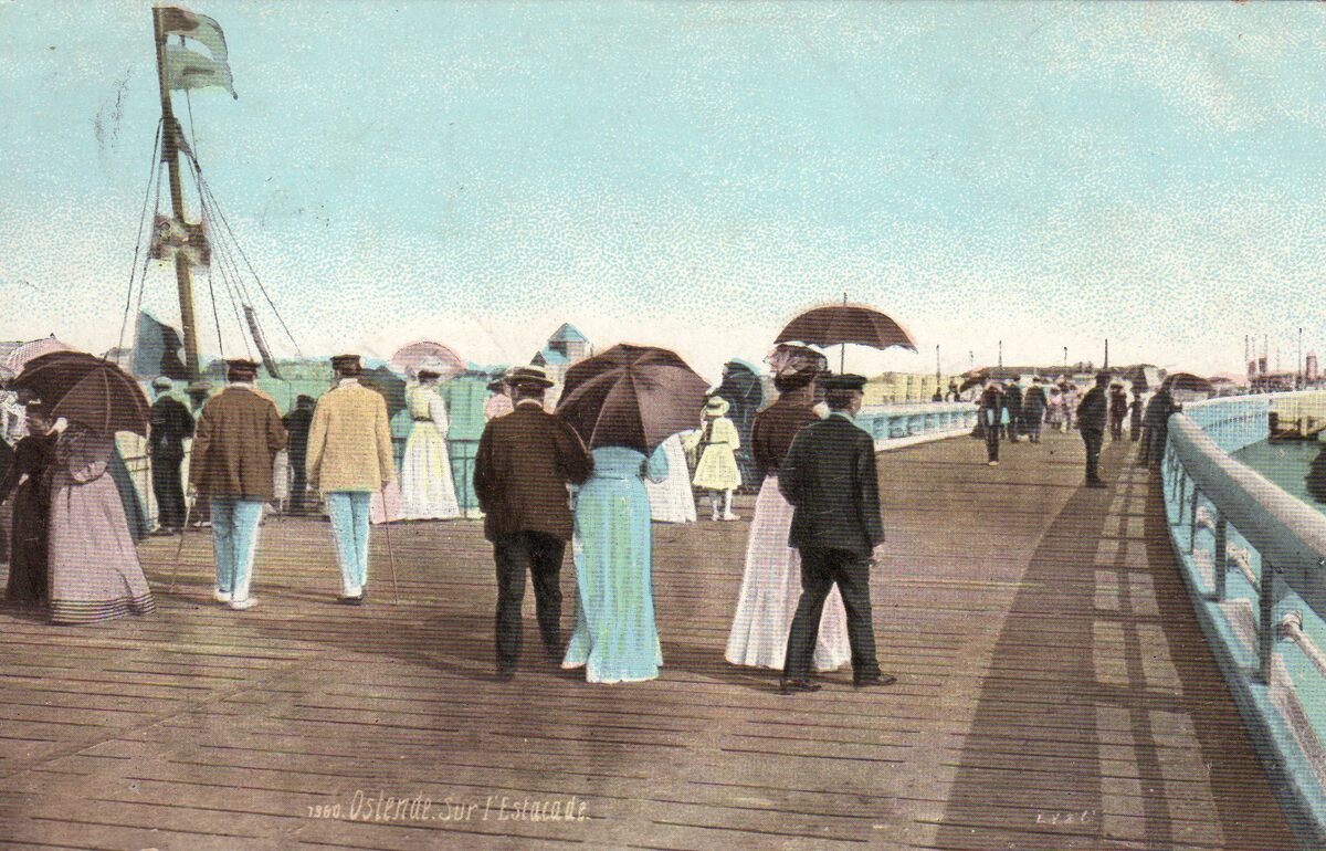 Aqua Photo, N° 1960. - Ostende - Sur l'Estacade. - Bijgekleurde kaart. - Wandelen op het Weststaketsel tijdens de Belle Epoque.