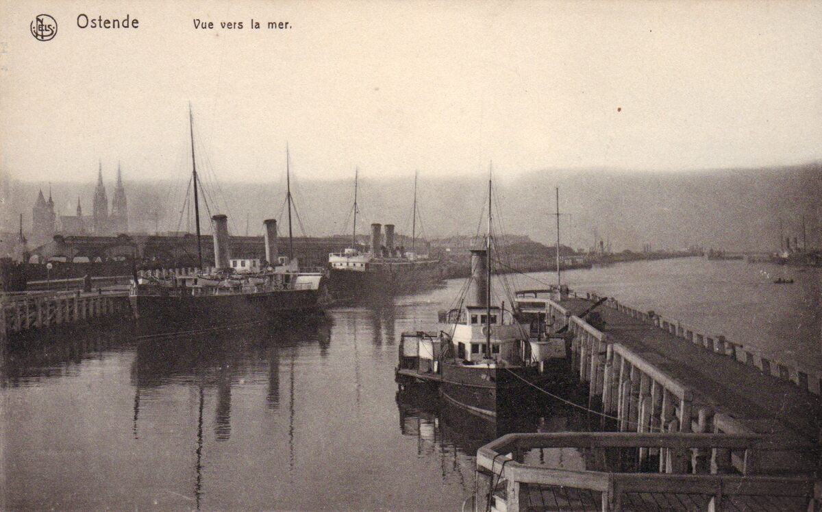 Ed. Nels, Bruxelles, Serie Ostende, N°91. - Ostende - Vue vers la mer. Nels serie Ostende. Links, aangemeerd de pakketboten "Princesse Joséphine" en "Princesse Elisabeth" nabij het Zeestation. Rechts, de sleepboot "Remorque". (Volksnaam "Zwarte Triene"). Op de achtergrond de torens van de Sint Petrus en Pauluskerk.