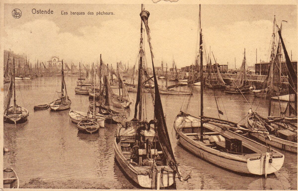 Ostende. Des barques des pêcheurs. Vooraan, eenmansgarnaalboten. Op de achtergrond, links, het gebouw van de reddingsdienst, in de volksmond "De Permerensje". Links de Visserskaai