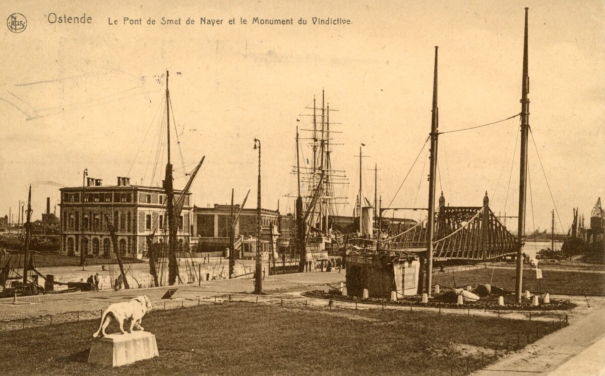 Nels/Thill série 13, 120. - Le Pont de Smet de Naeyer et le Monument du Vindictive. - Het Vindictivegedenkteken, oorlogsmonument gelegen tussen de Demey-brug en de Graaf de Smet de Naeyer-brug. Bestaande uit de boeg van het Engelse oorlogsschip "Vindictive" en de masten van de Engelse oorlogsschepen "Thetis" en "Intrepid". Deze drie schepen werden tijdens de Eerste Wereldoorlog tot zinken gebracht, respectievelijk in Oostende en Zeebrugge, om de havens te blokkeren voor Duitse duikboten.
