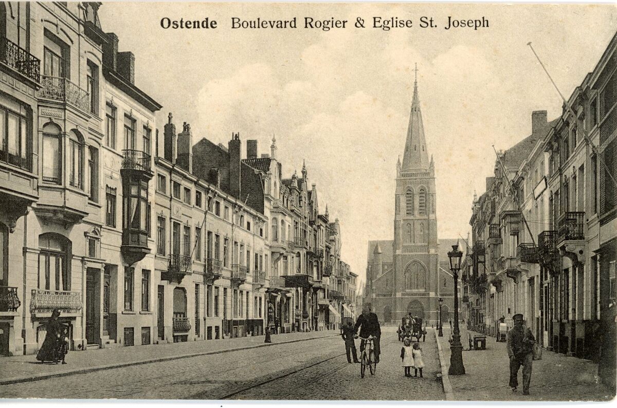 Bots-Reyns 7970. - Ostende Boulevard Rogier & Eglise St Joseph. De Rogierlaan met op de achtergrond de Sint-Jozefskerk. Let op de tramsporen van de eerste stadstram, een stoomtram.