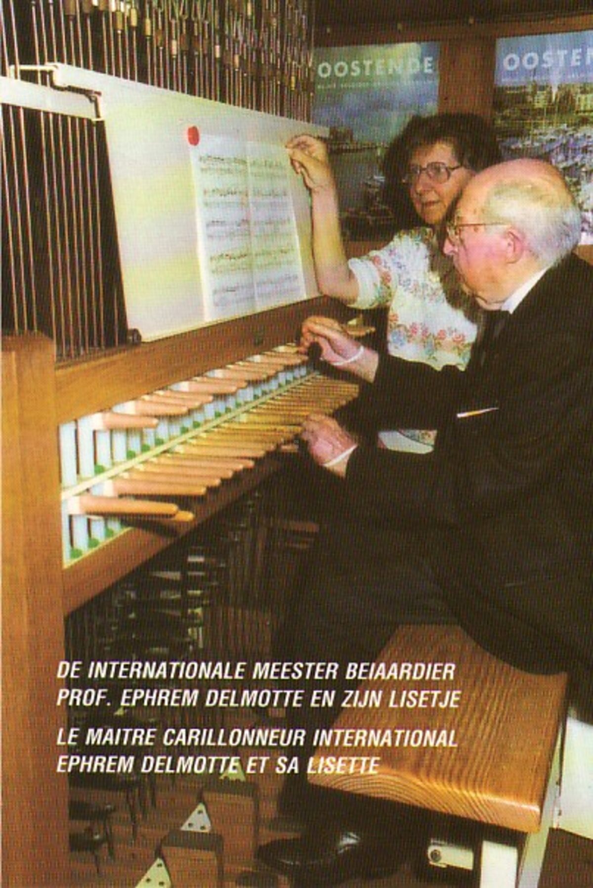 Foto : Ephrem Delmotte bespeelt de beiaard in het Feest- en Cultuurpaleis (Oostende), met hulp van zijn vriendin Lisetje