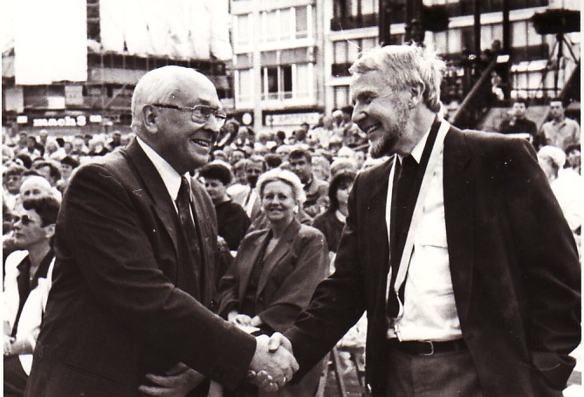 Formaat : 18 x 13 cm. Het Wapenplein. Hugo Weckx, politicus en Roland Laridon geven elkaar de hand. De blonde mevrouw, zittend, is Hilde Bultiauw-Roels.
