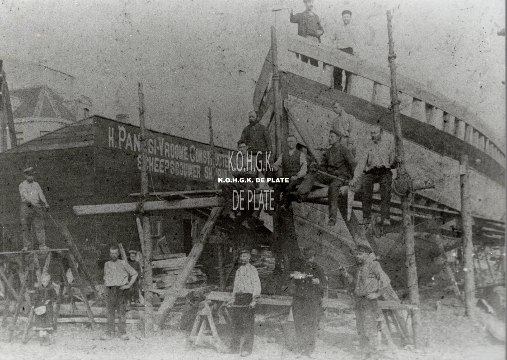 Afdruk. - Formaat : 13 x 18 cm. - Bouw van een houten vissersvaartuig op de scheepswerf van H. Panesi-Vroome gelegen aan het derde handelsdok.