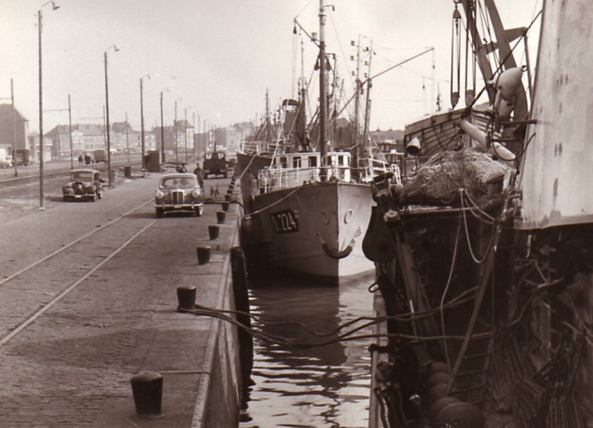 Formaat : 18 x 13 cm. - Vissersvaartuigen gemeerd in het Visserijdok, o.a. de O.224 "Charel-Denise". Links, de Hendrik Baelskaai