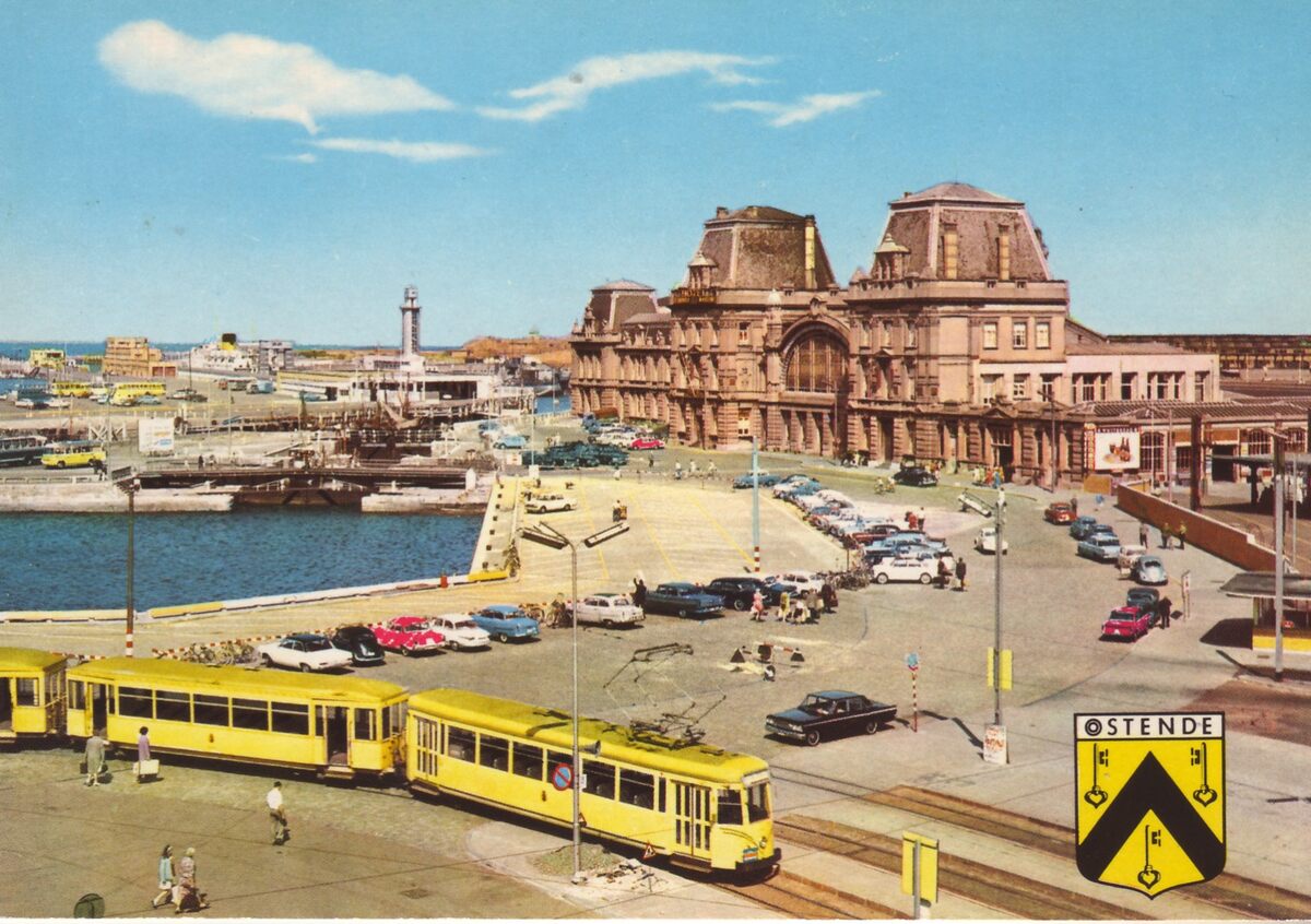 Krüger, N° 933/89. - Het Zeestation gelegen aan het eerste handelsdok. We zien nog de oude zeesluis, die de haven verbindt met de handelsdokken. De Mercatorsluis werd in gebruik genomen midden de zeventiger jaren en ligt meer naar links en verbindt het Montgomerydok met het eerste handelsdok. Op de voorgrond, een kustram