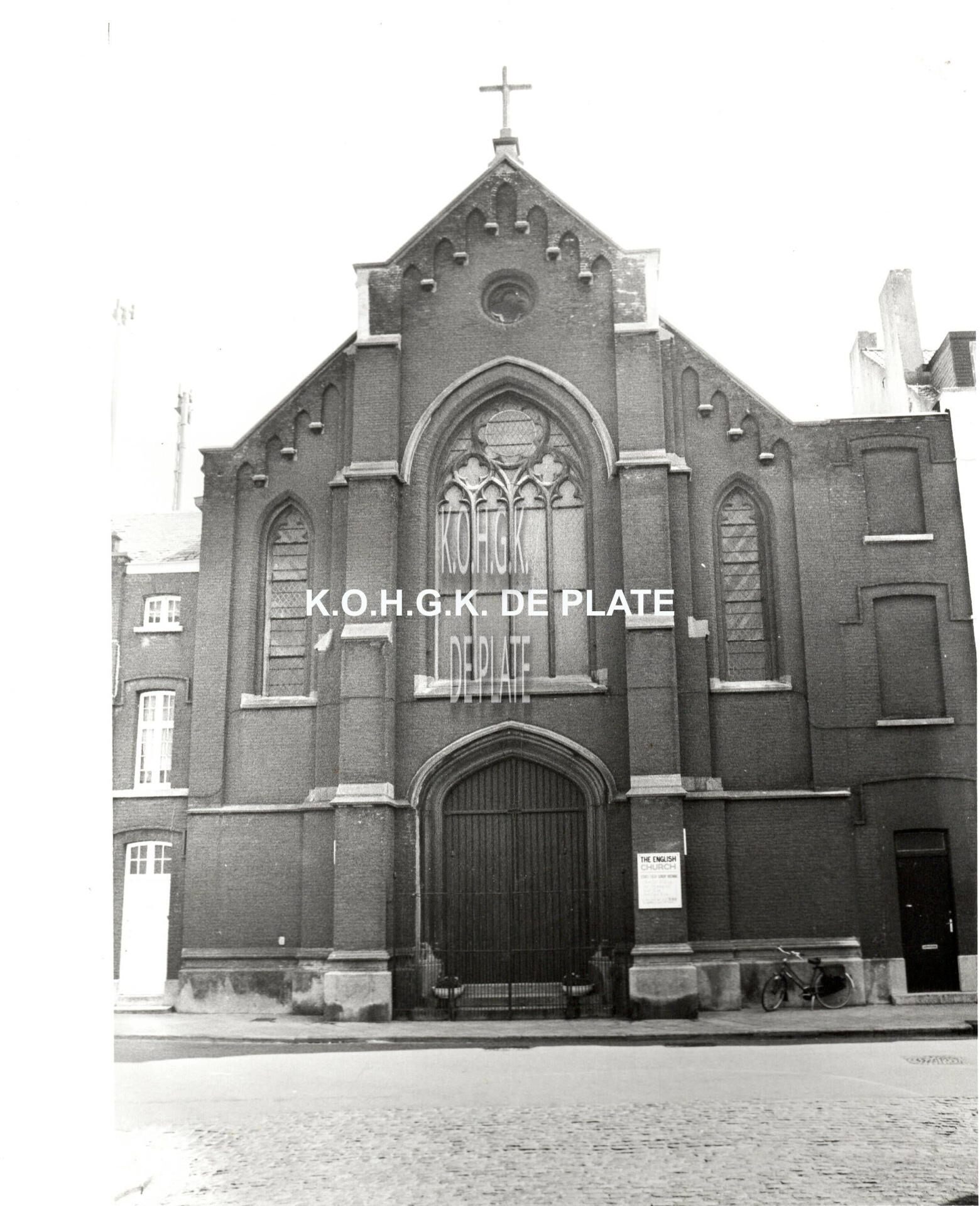 Formaat : 21 x 15 cm. - Anglicaansekerk. Langestraat 99-101. "The English Church", bedehuis voor de Anglicaanse eredienst naar ontwerp van architect F. Laureys (Oostende). Opgetrokken in 1863-1864 op de plaats van het oud slachthuis gelegen aan het toenmalig oostelijk uiteinde van de Langestraat. De kerk werd op 23 januari 1865 ingewijd door bisschop Samuel Wilberporce. De kerk heeft geen specifieke naam, is dus niet toegewijd aan één of andere heilige en wordt simpelweg de Engelse kerk genoemd. Ze staat open voor alle protestanten.