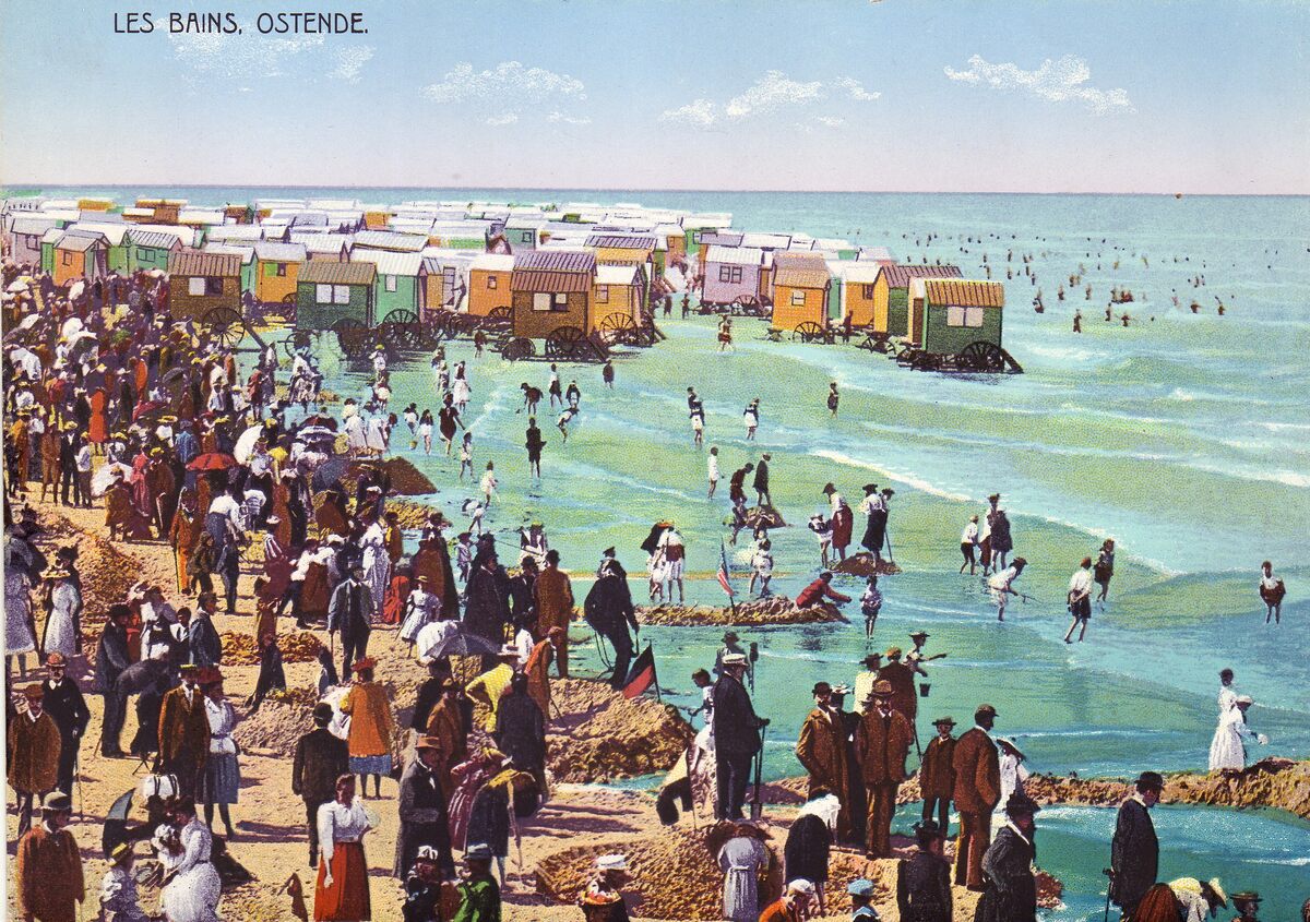 Formaat : 19 x 14 cm. - Le Bon. - Les bains, Ostende. - Bijgekleurde prentkaart. Strandrecreatie en op de achtergrond, de traditionele badkarren.