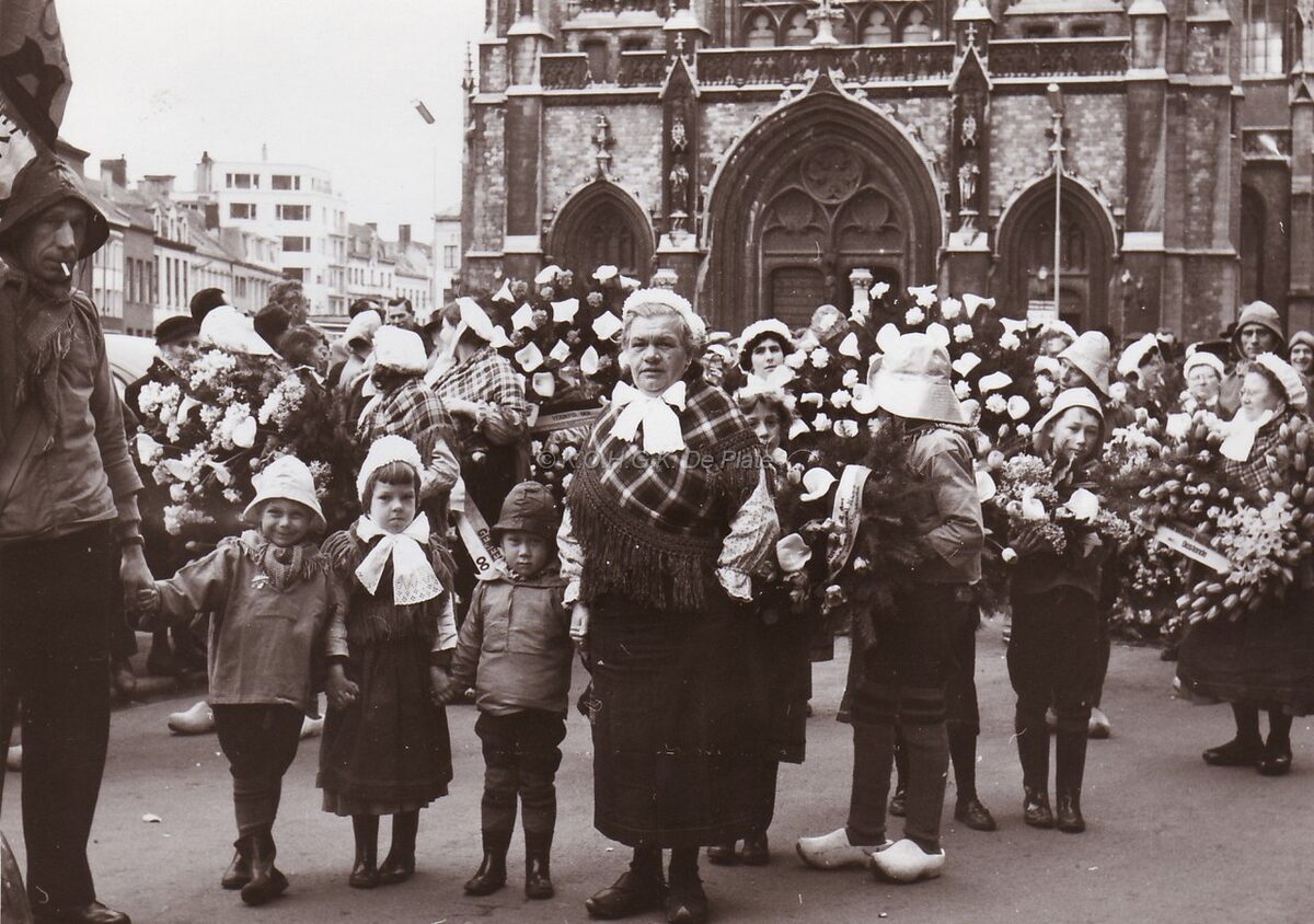 "De Vismijnvrienden" dragen de kransen voor een plechtigheid. Hier op het Sint Petrus en Paulusplein