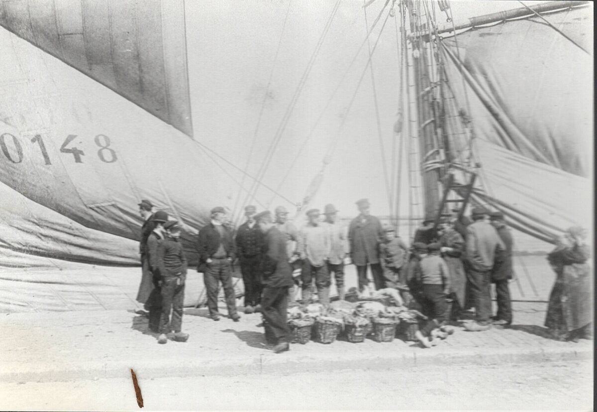 Formaat : 10 x 15 cm. - Vissers met visbennen, op de achtergrond de O.148 Zoë van eigenaar Al. Makelberghe en reder Aug. Robbaert.