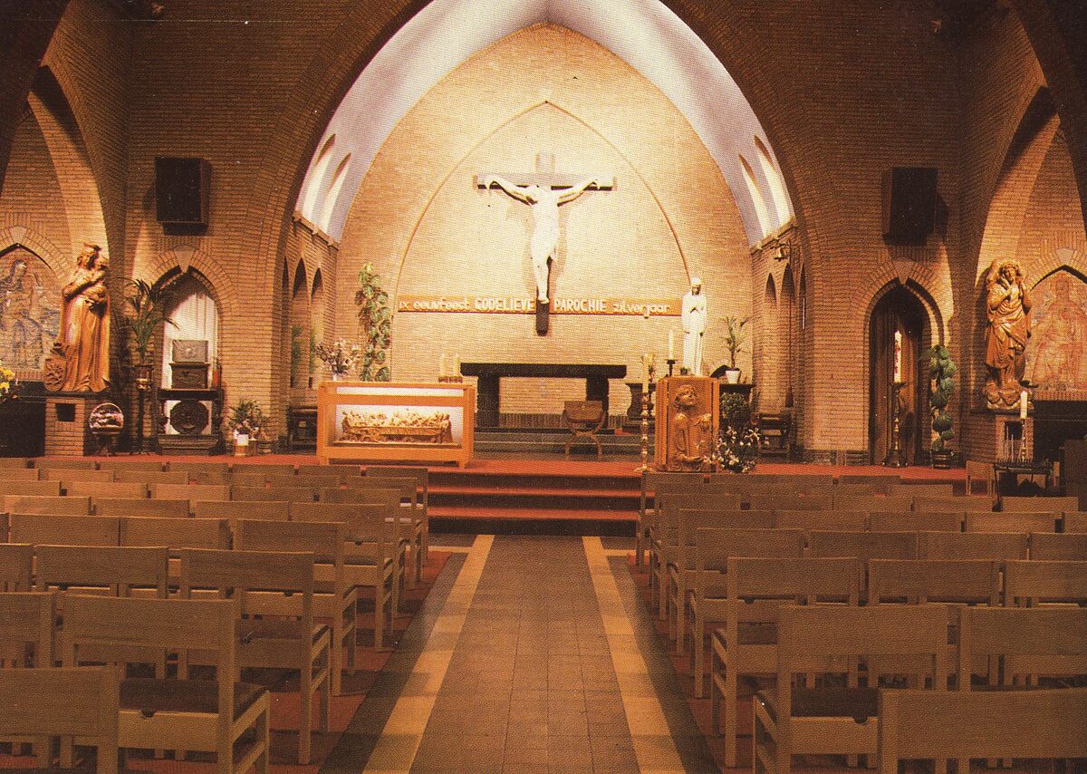 Crea Speciaaldruk. - Boven de zijaltaren, muurschilderijen op baksteen van H. Hart en Onze-Lieve-Vrouw van altijddurende Bijstand, door F. Kieckens. In het koor : kruisbeeld door Daniël Devriendt. Glasramen door Cor Westerduyn : iconografie in verband met leven en verering van Sint-Godelieve.