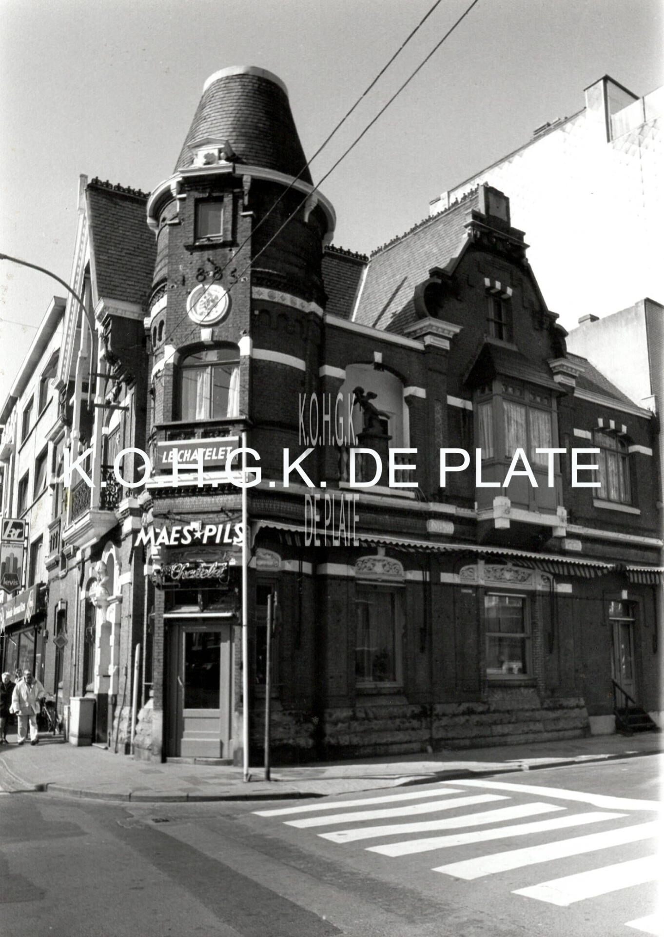 Formaat : 18 x 13 cm. - Café "Le Chatelet", hoek Koninginnelaan en Nieuwpoortsesteenweg 8, aan het kruispunt Petit Paris. Beschermd als monument bij MB van 14/01/1994. Het vroegere "Hôtel du Chatelet". Met muurankers gedateerd 1885. Bemerk de loggia, afgelijnd met balustrade waarop een Cupidobeeld.