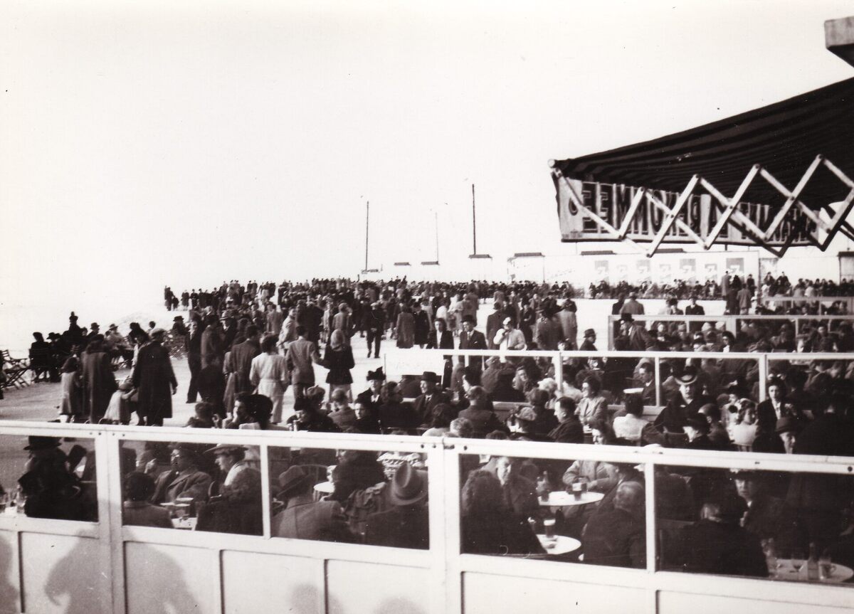 Formaat : 13 x 18 cm. - Veel volk op de terrassen van Petit Nice (Albert I -promenade). De Kursaal is nog niet herbouwd.