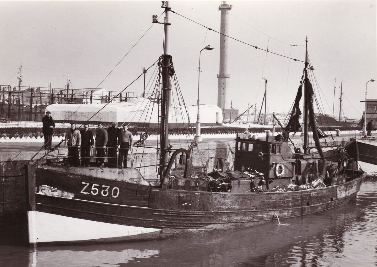 Formaat : 13 x 18 cm. - Het Zeebrugse vissersvaartuig Z.530 Frank in het sas van het Visserijdok. De Z.530 Frank was een houten motortreiler gebouwd in 1928 op de scheepswerf van Jules Denye. Het bleef in de vaart tot 1965.