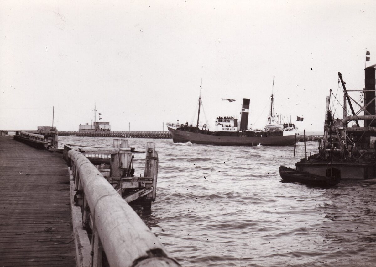 Formaat : 13 x 18 cm. - Een vissersvaartuig van de Pêcheries à Vapeur in de havengeul
