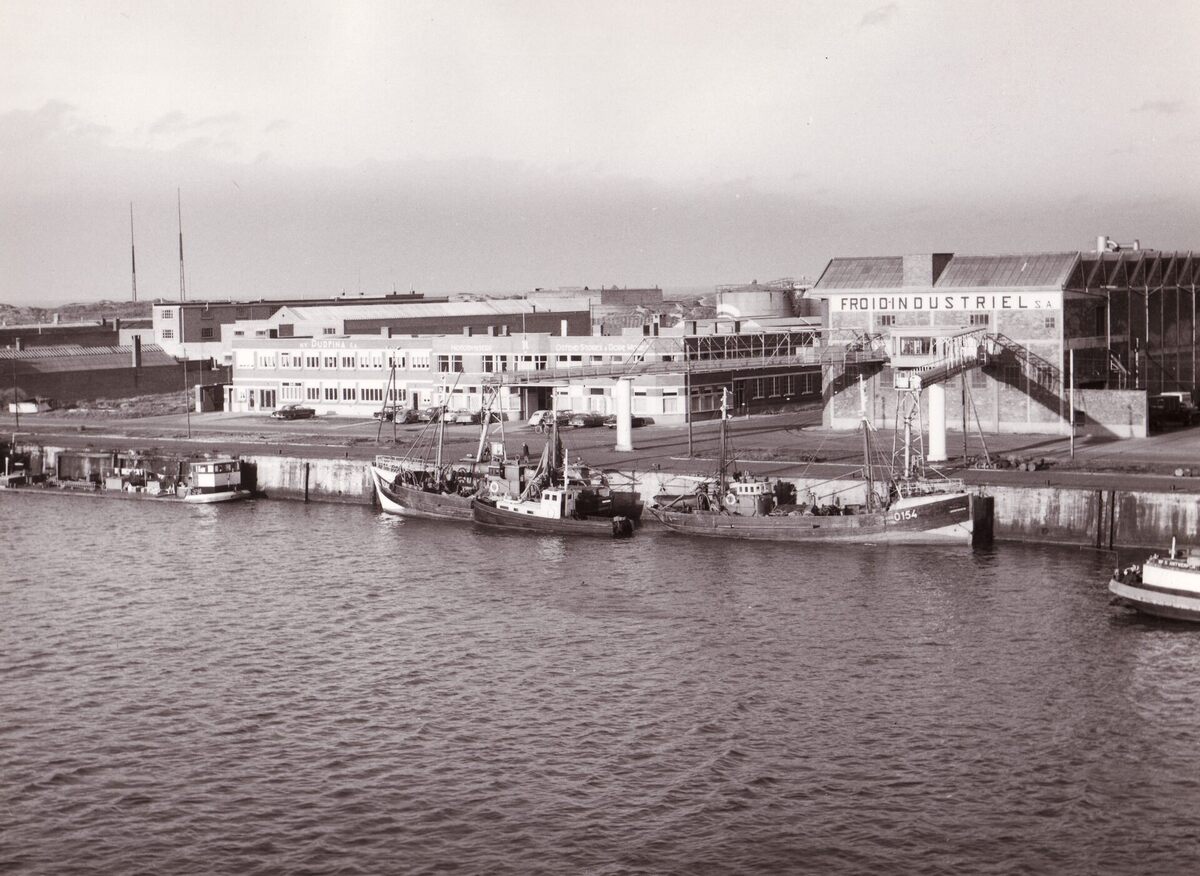 Formaat : 18 x 24 cm. - Het Visserijdok en de Hendrik Baelskaai van op het dak van de Vismijn. Links in de duinen de zendmasten van het leger. Rechts de ijsfabriek Froid Industriel