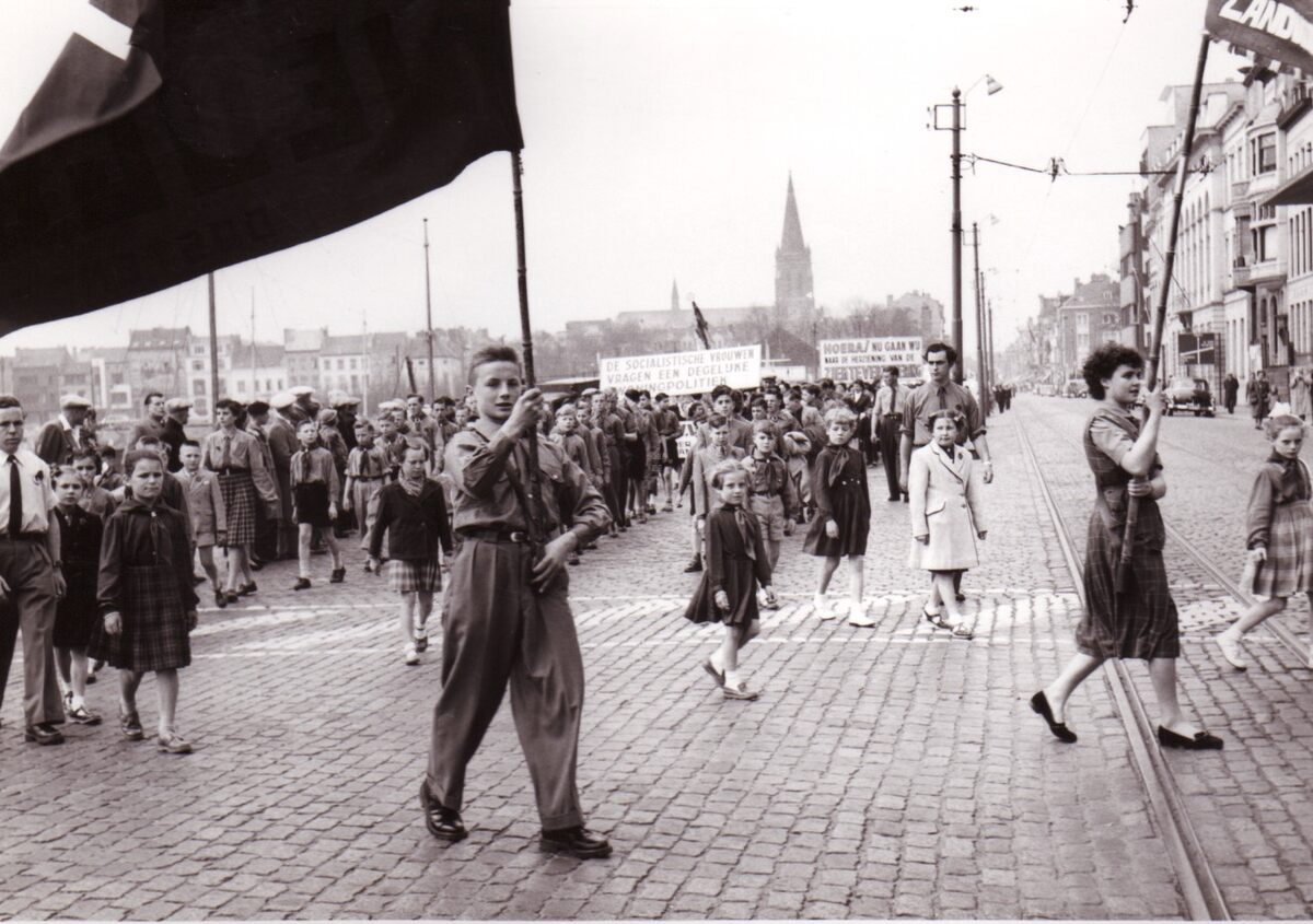De Rode Valken (?), met vlag in de 1-meistoet op de Vindictivelaan ter hoogte van de Kapellestraat.