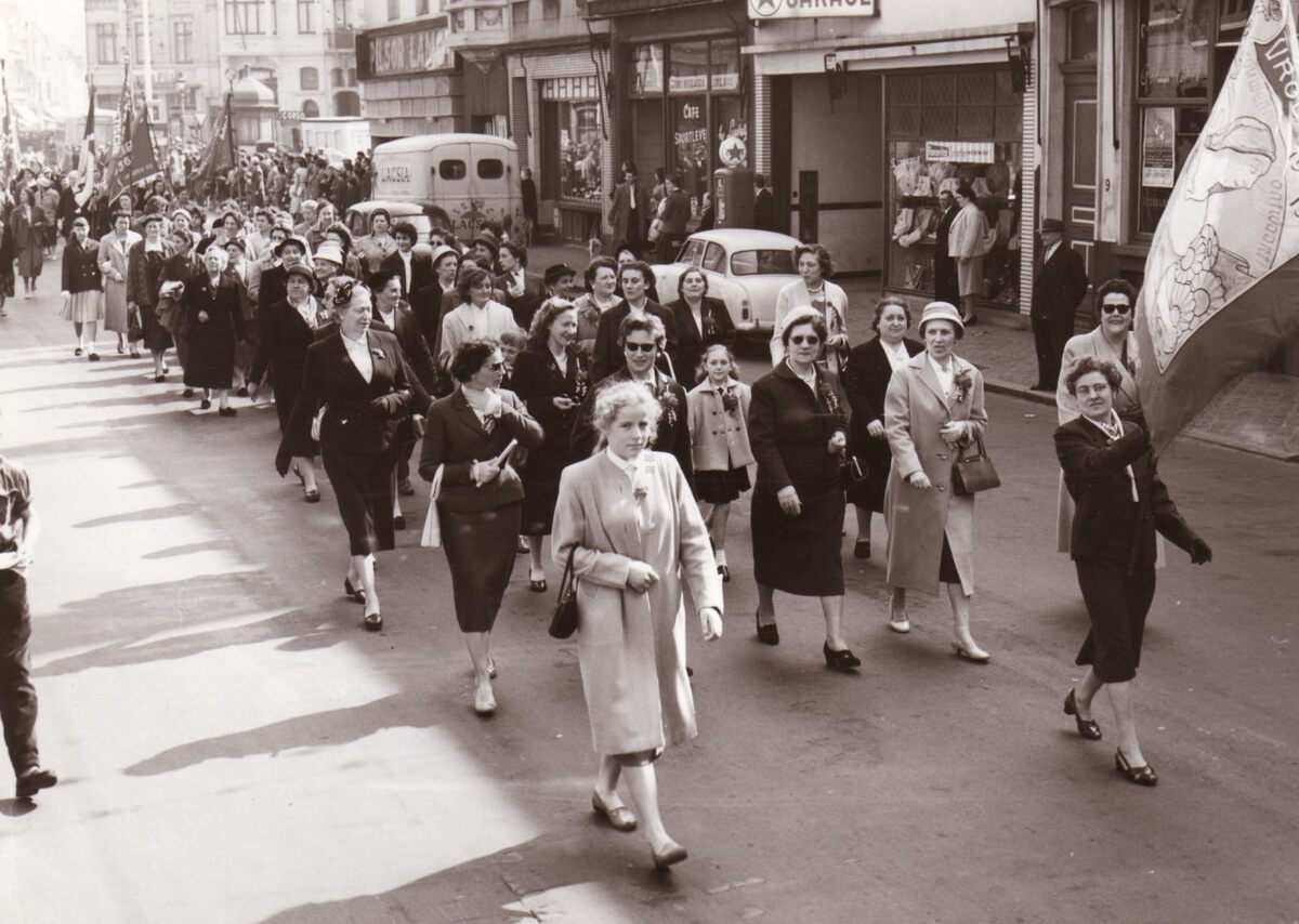 De Socialistische Vooruitziende Vrouwen met vaandel in de 1-meistoet op de Nieuwpoortsesteenweg nabij het kruispunt Petit Paris.