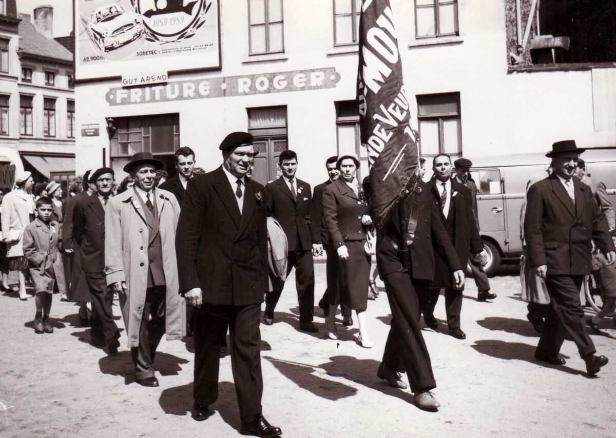 Een afdeling van de Ziekenbond Moyson, afdeling Oostende-Veurne-Diksmuide in de 1-meistoet, gaat de Jules Peurquaetstraat in, aan de hoek Euphrosina Beernaertstraat en Torhoutsesteenweg. Rechts van het vaandel loopt Raymond MIROIR, schepen. Op de hoek met de Torhoutsesteenweg, "Friture Roger".