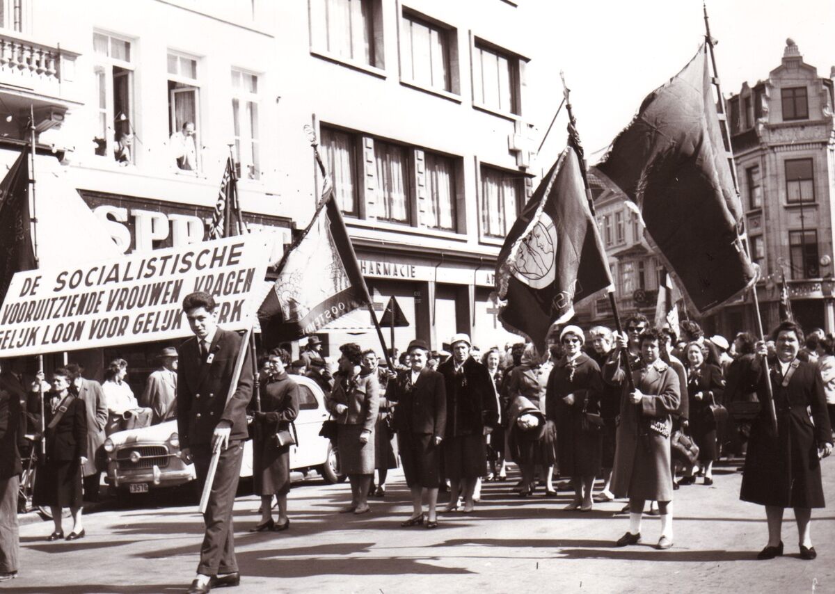 De S.V.V. (Socialistische Vooruitziende Vrouwen) met vaandels in de 1-meistoet aan het kruispunt Petit Paris. Er wordt een bord gedragen met de tekst : "De Socialistische Vooruitziende Vrouwen Vragen Gelijk Loon Voor Gelijk Werk".