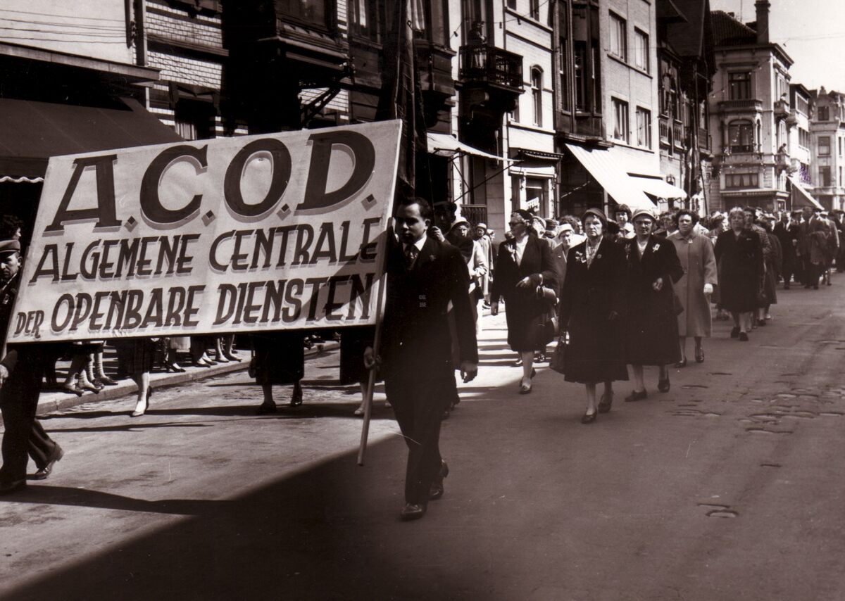 Het A.C.O.D., socialistisch syndikaat in de 1-meistoet op de Nieuwpoortsesteenweg, juist voorbij het kruispunt Petit Paris. Er wordt een bord gedragen met de tekst : "A.C.O.D. Algemene Centrale der Openbare Diensten".